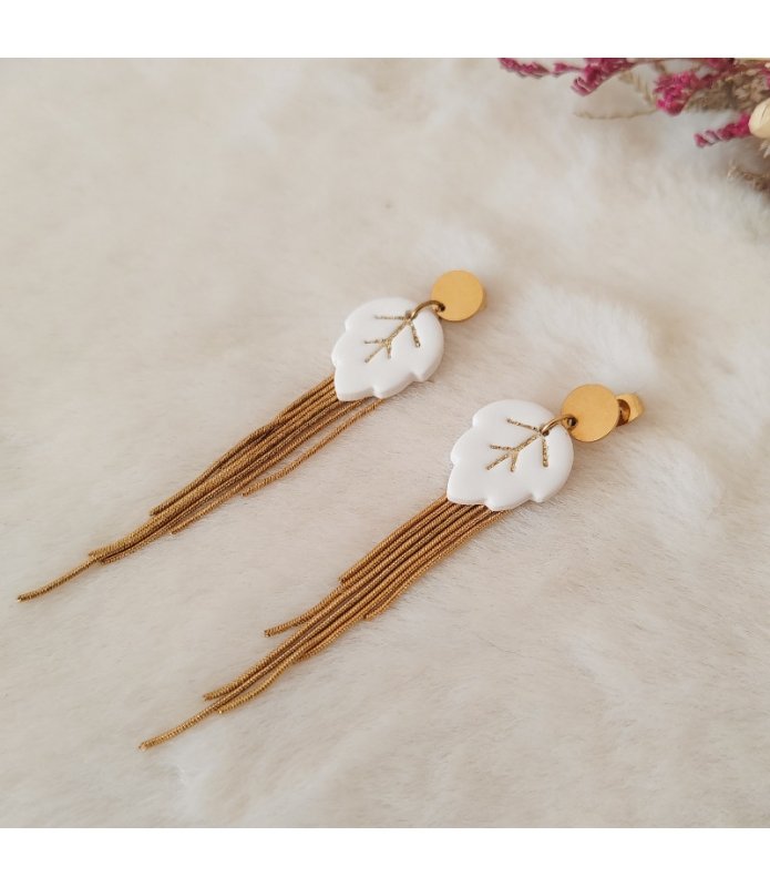 Adoptez les longues boucles d'oreilles feuilles blanches "Komorebi", une touche élégante et lumineuse. Elles sont réalisées en argile polymère, quelques paillettes et acier inoxydable doré.