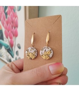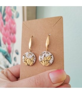 Boucles d'oreilles rondes "Mizuho" beige aux motifs fleurs et feuilles en argile polymère et acier inoxydable doré