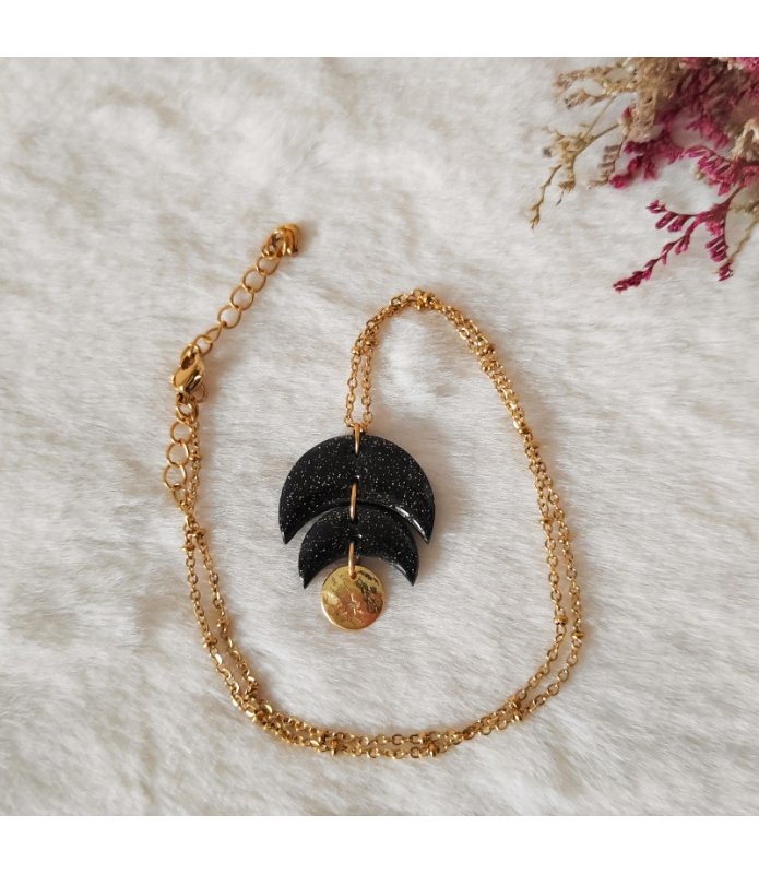 Adoptez le collier "Sohalia" noir pailleté, une touche élégante et lunaire. Il est réalisé en argile polymère, résine, acier inoxydable doré, et laiton doré à l'or fin 24K.