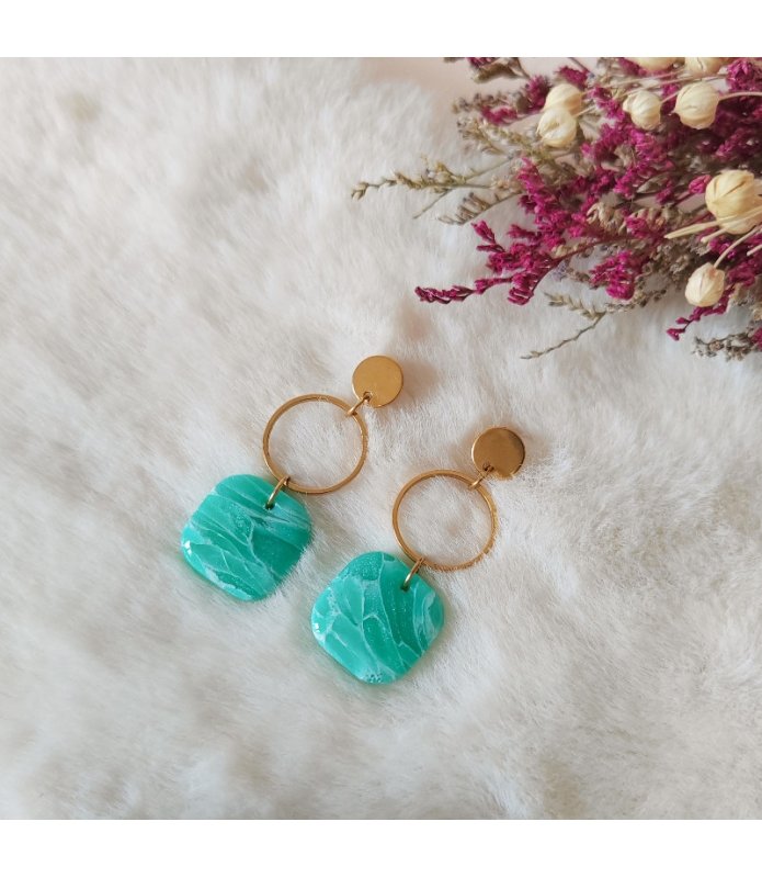 Boucles d'oreilles "Shota" marbrées vertes – Élégance géométrique en argile polymère