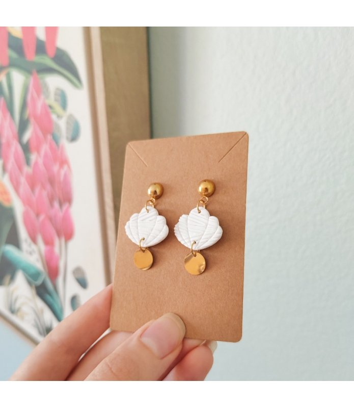 Boucles d'oreilles légères Miko coquillages en argile polymère blanc texturé vague, clous en acier inoxydable doré. Leur design élégant et leur légèreté en font un bijou parfait pour accompagner vos tenues du quotidien ou sublimer une occasion spéciale.