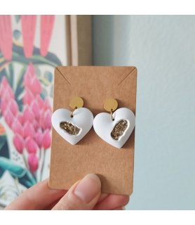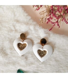 Adoptez ces boucles d'oreilles "Kokoro no Hikari" blanches, qui veut dire Faible et Fort en japonais, malgré qu'il soit cabossé le coeur reste rempli de paillettes.