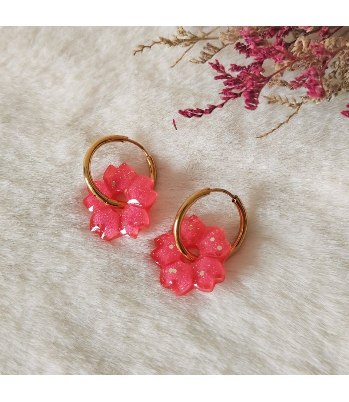 Adoptez les créoles fleurs "Sakura" rose, une touche colorée et poétique, légèrement pailletée pour illuminer les journées.
